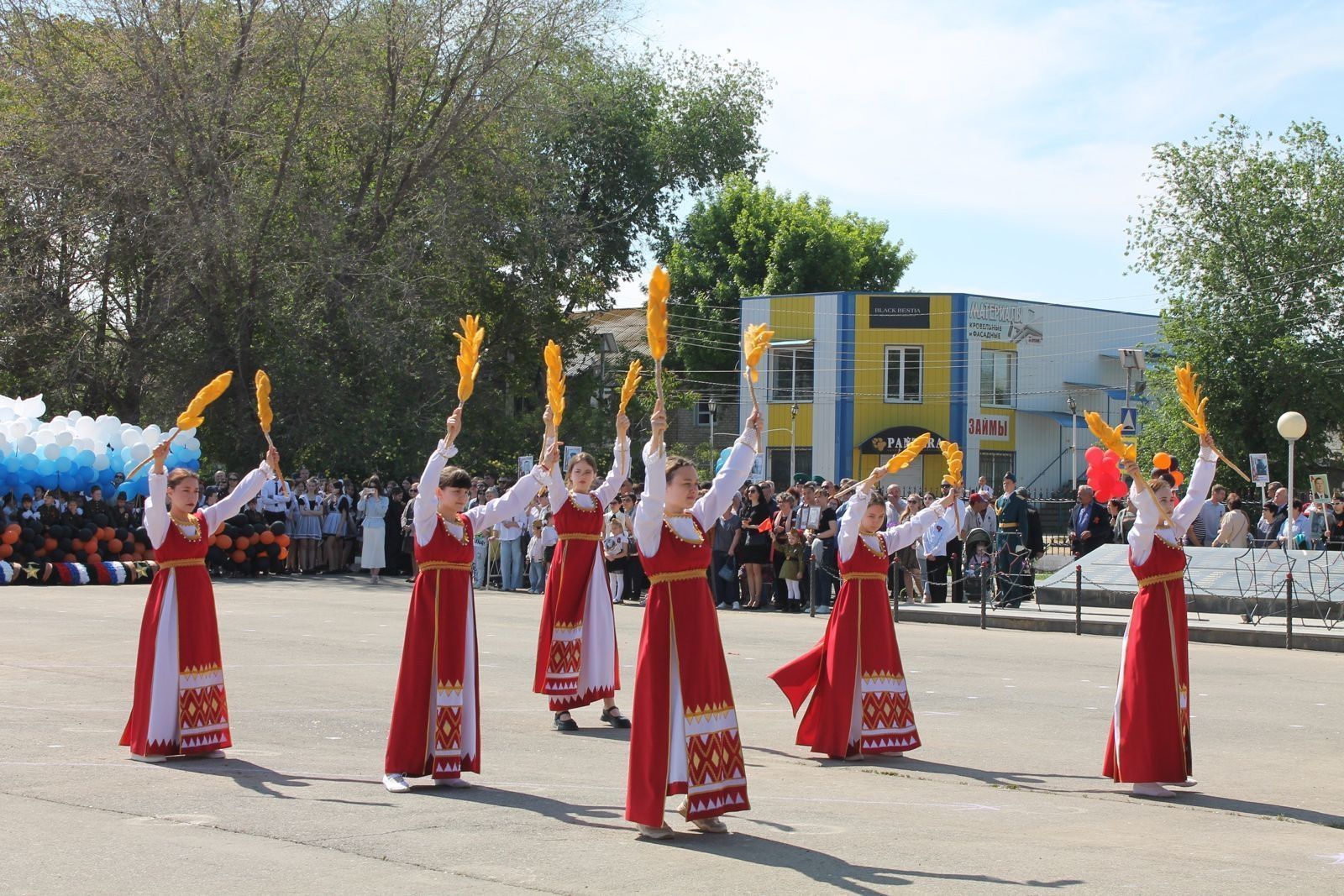 В постановке на площади вновь ожила история военных лет: храбрые бои на фронтах, самоотверженный труд в тылу, слёзы матерей и жён. В данной постановке приняли участия студенты нашего филиала.