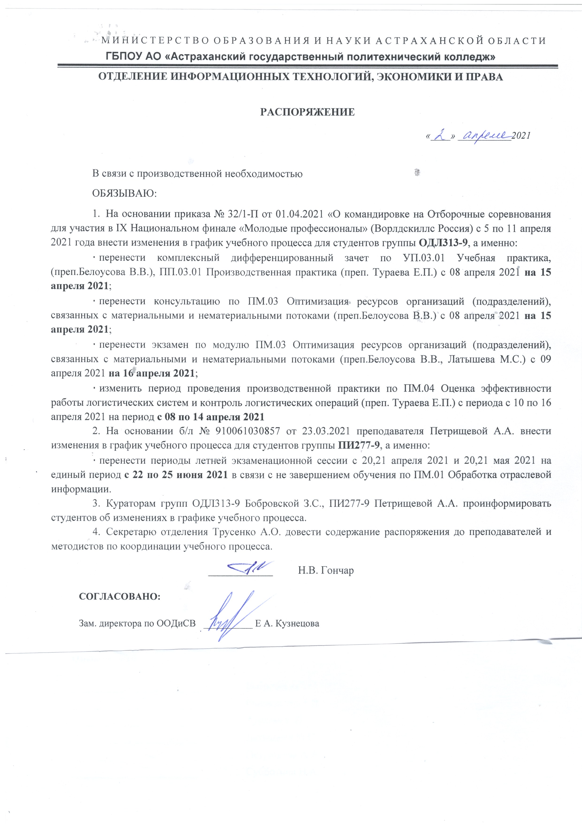ПРИКАЗ №4-у от 11.01.2024: Об особом режиме реализации ОП в группах отделения (ОСА-421, ПНГ-1109, ДН-1209, ТГ-1109, ПК-2209, ТУ-3109, ДН-491, ГРД-2109, ГРД-494, ГРД-3209, ПК-1209, ТЭ-2109, ДН-2109, ПК-3209, ПК-482) (с 12.01 по 18.01.2024 (включительно))