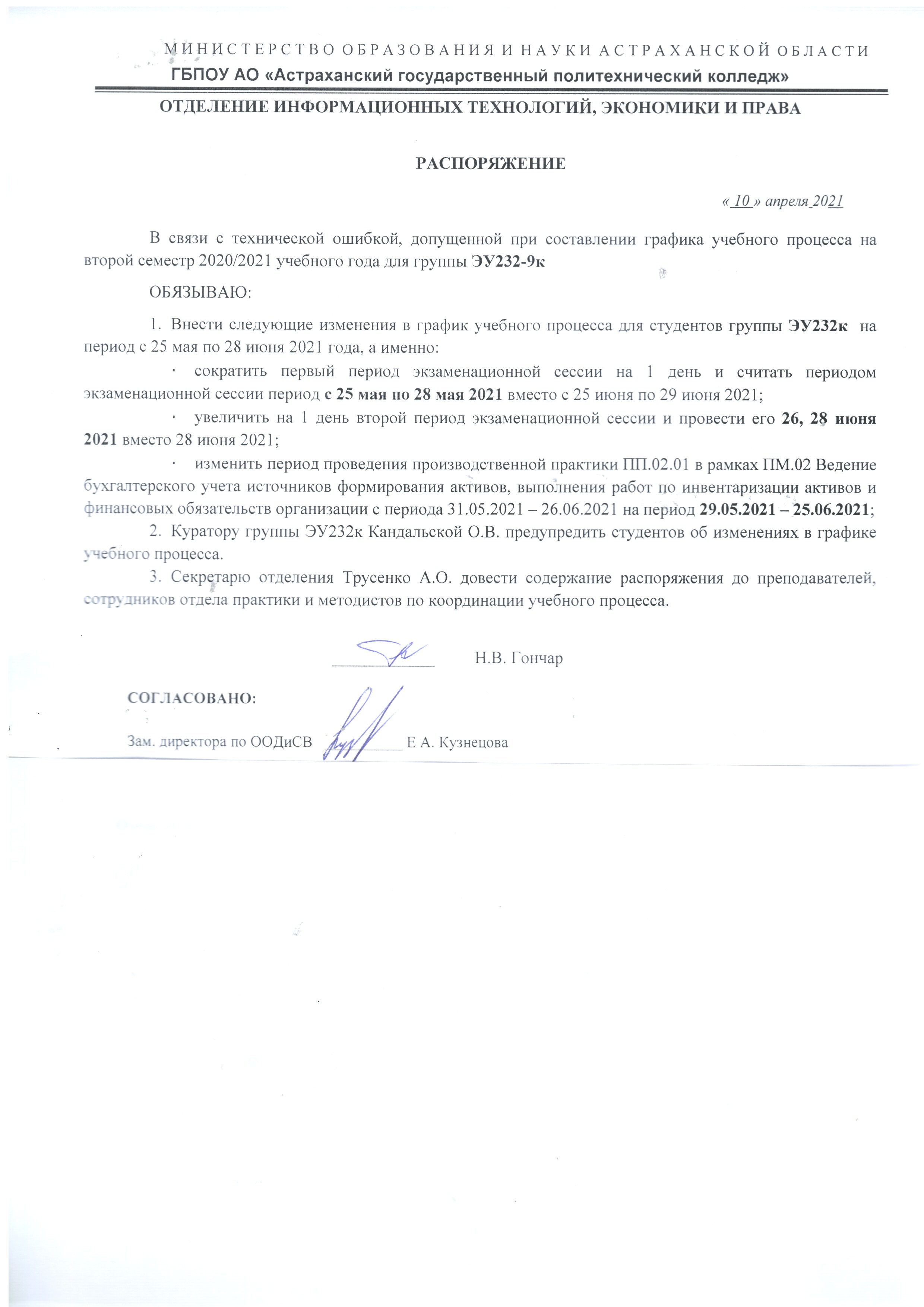 Внесенные изменения в график учебного процесса группы ЭУ 232