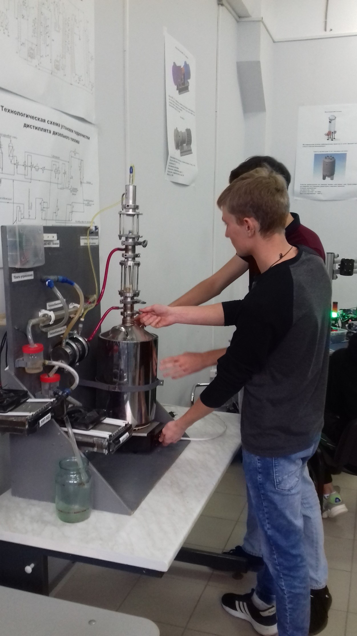 Студенты нашего колледжа очень изобретательны, поэтому была представлена одна из дипломных работ «Ректификационная колонна». Принцип её работы в отделении нефтяного продукта на одиночные составляющие при помощи водяного пара.