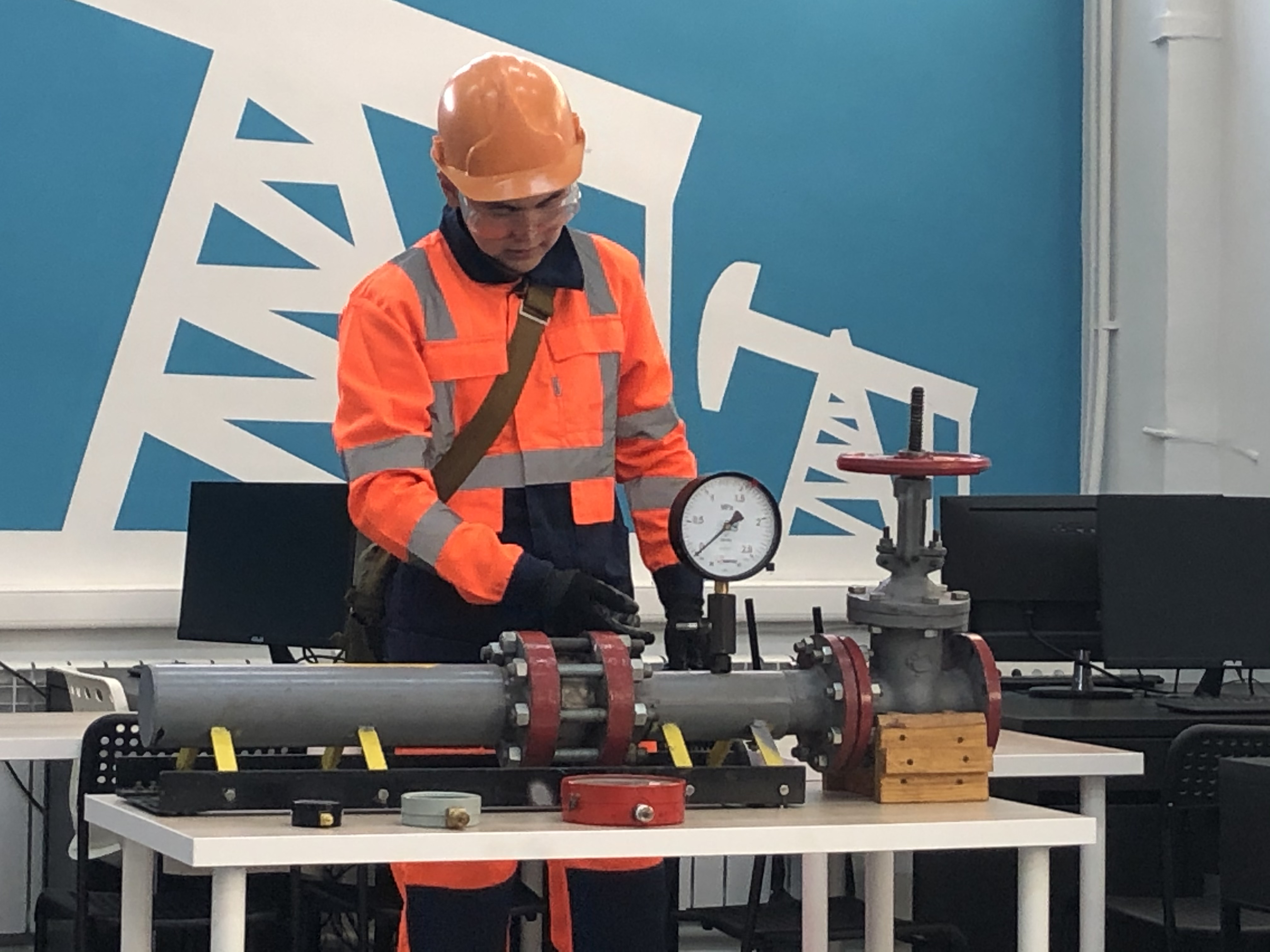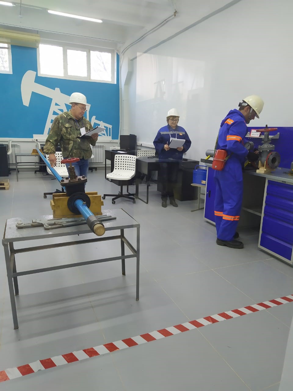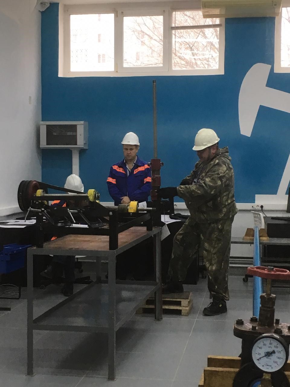 Мастерская "Добыча нефти и газа" представляла полномасштабный тренажер "Обслуживание скважин, оборудованных погружным электроцентробежным насосом" и полигон, оборудованный на данный момент станком-качалкой.