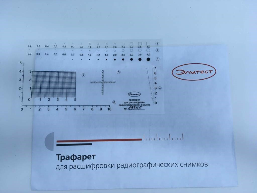 Трафарет для расшифровки радиографических снимков (Элитест) - предназначен для оценки линейных размеров обнаруженных дефектов (трещин, непроваров, пор, шлаковых, вольфрамовых и др. включений) в соответствии с требованиями ГОСТ 7512-82, ГОСТ 23055-78, ПНАЭ Г-7-010-89, ПНАЭ Г-7-017-89 (при расшифровке радиографических снимков сварных соединений) |