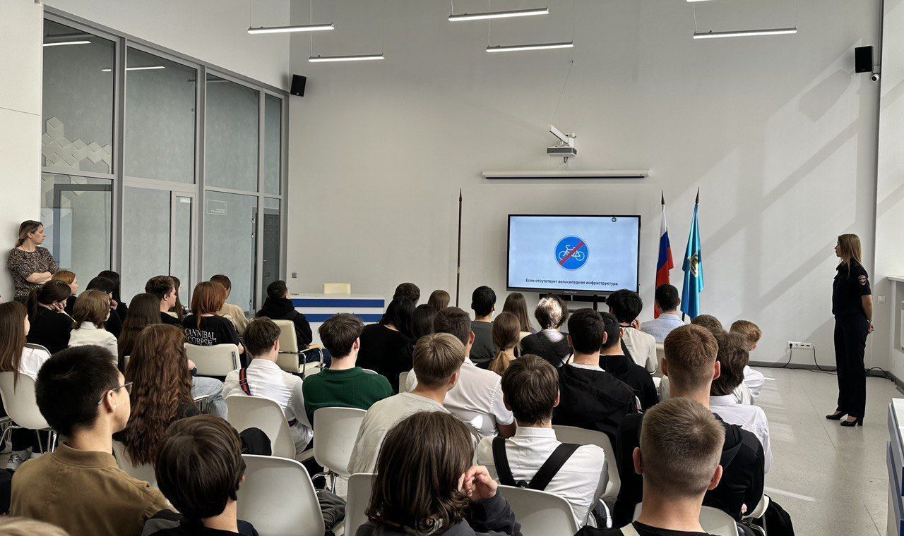 Инспектор рассказала студентам о наиболее распространённых нарушениях среди водителей двухколёсных транспортных средств и последствиях невнимательности на дороге.