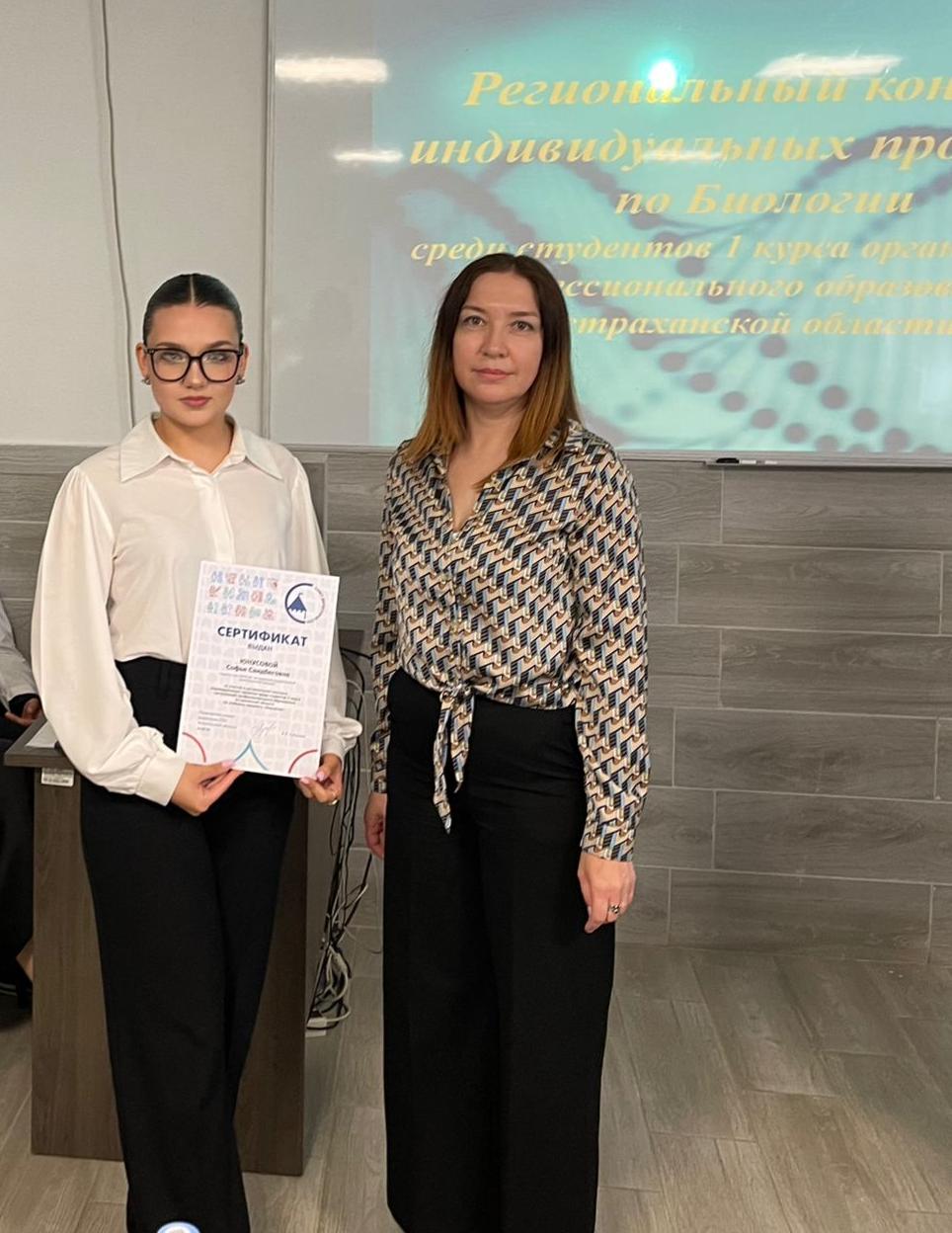 Первое место заняла студентка отделения информационных технологий, экономики и права ГБПОУ АО «Астраханский государственный политехнический колледж» Юнусова Софья, представившая свой исследовательский проект по теме «Анализ морфометрических показателей высших растений в условиях нефтяного загрязнения почвы» под руководством профессионального наставника и преподавателя Шаплыгиной Ю. Н.