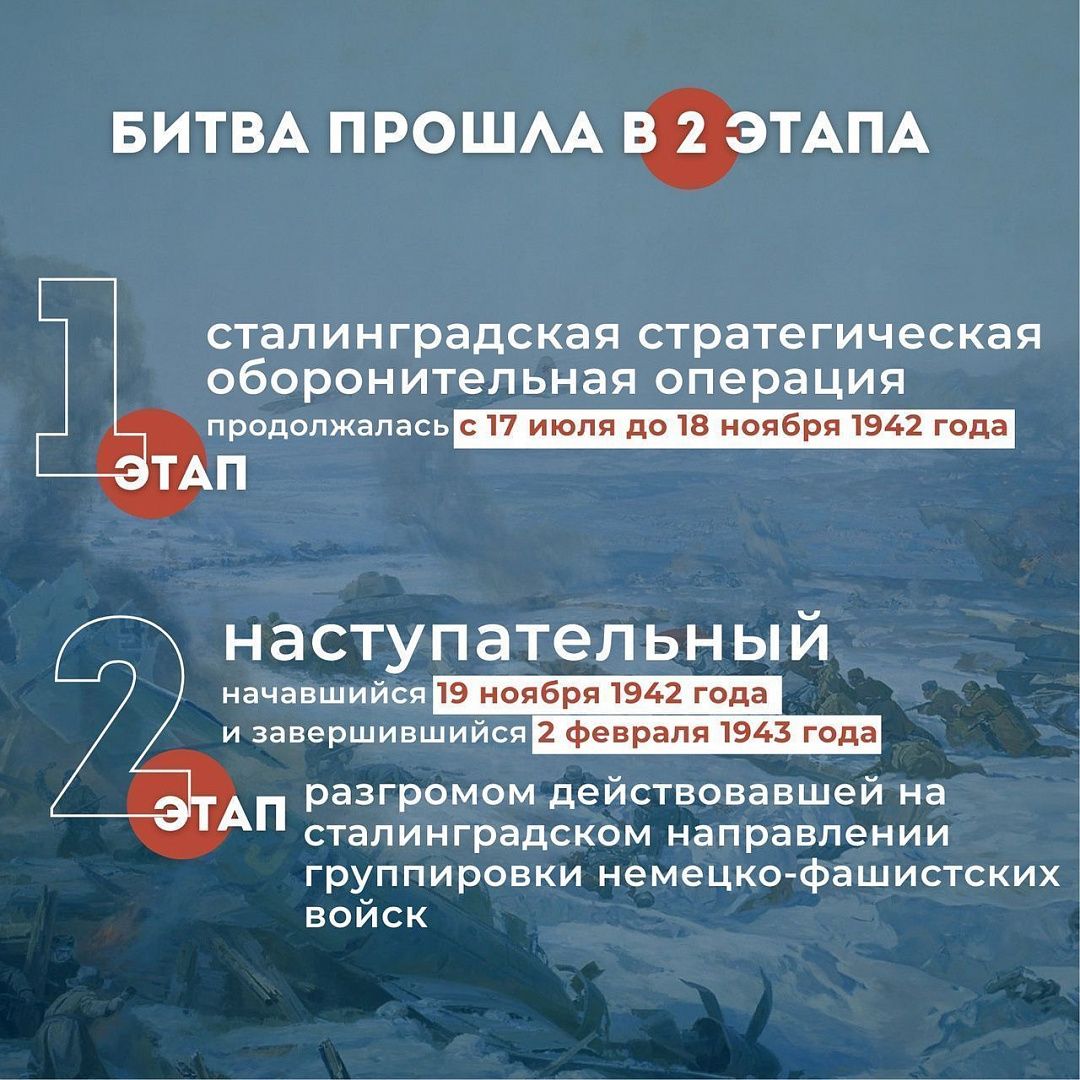 Битва за Сталинград проходила в два этапа: с 17 июля 1942 года город оборонялся, а 19 ноября 1942-го советские войска перешли в контрнаступление. 31 января 1943 года командир немецкой группы войск Паулюс сдался в плен, а 2 февраля город был освобожден от фашистов.