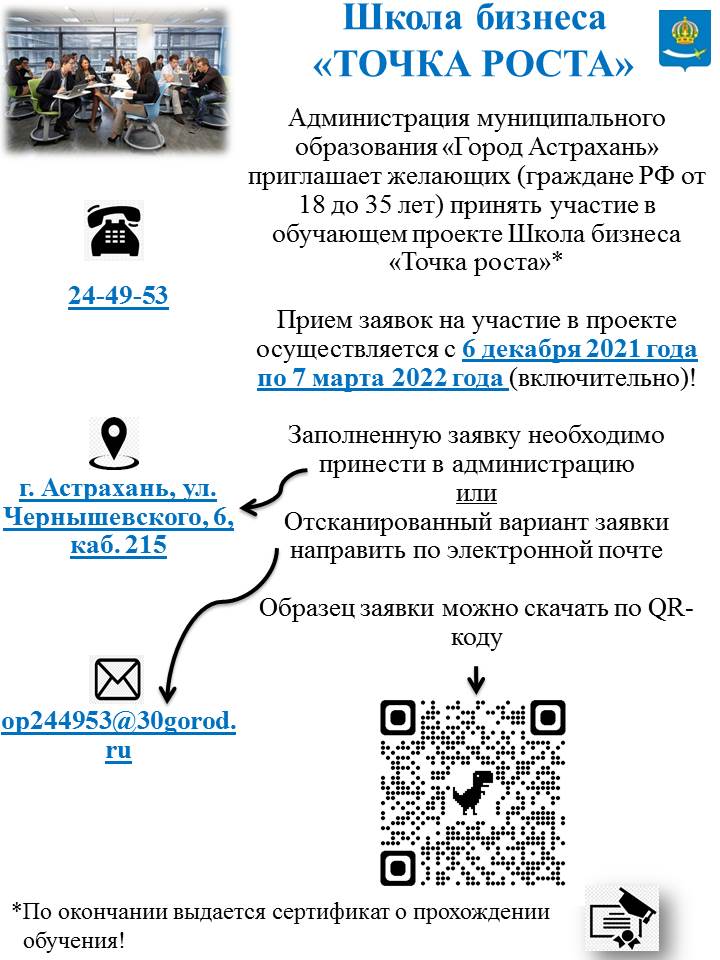 Администрация муниципального образования «Город Астрахань» приглашает молодых людей в возрасте от 18 до 35 лет (включительно) принять участие в проекте «Школа бизнеса "Точка роста"».