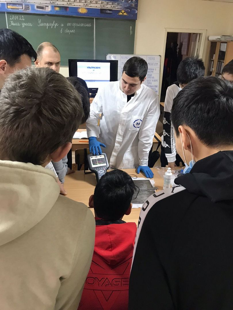 Преподаватель механического отделения Астраханского государственного политехнического колледжа Владимир Денисович Балахонов в рамках сетевого партнёрства с колледжем ЖКХ АГАСУ провел бинарный урок на тему «Ультразвук и его применение в сварке». Владимир Денисович продемонстрировал студентам практические навыки по обнаружению дефектов сварного соединения с использованием ультразвукового дефектоскопа «Мастер А1212». Он также рассказал учащимся о важности контроля качества ответственных конструкций.