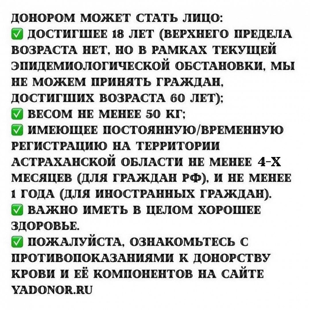 Ознакомиться со списком противопоказаний можно на сайте Службы крови www.yadonor.ru