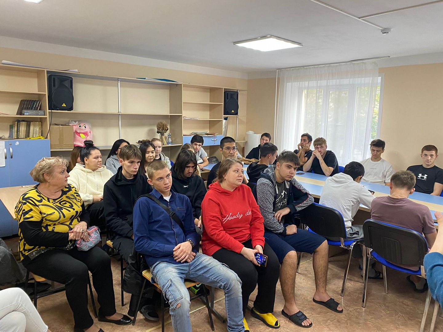С учащимися АГПК встретились начальник отделения подготовки населения управления гражданской обороны и защиты населения Главного управления МЧС России по Астраханской области Виктор Орлов и заместитель руководителя регионального отделения Всероссийского студенческого корпуса спасателей, студент группы СЭН-401 Кирилл Фатеев.