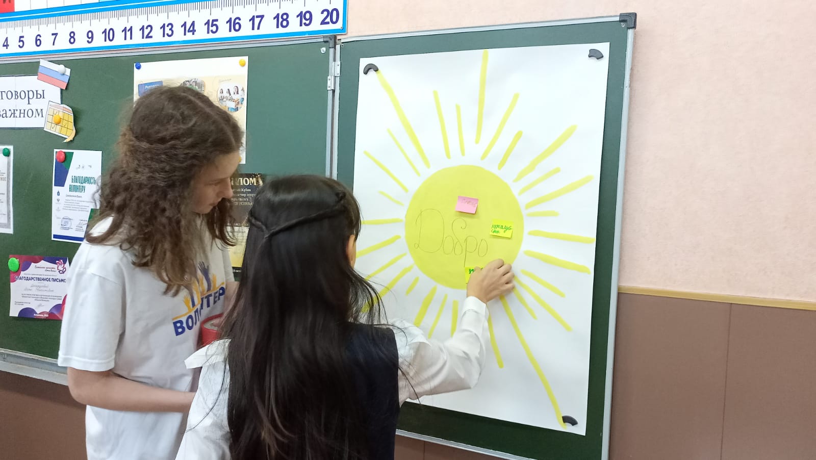 В завершение занятия волонтёры предложили детям собрать «Солнце добра», на лучах которого все желающие смогли написать о добрых делах.