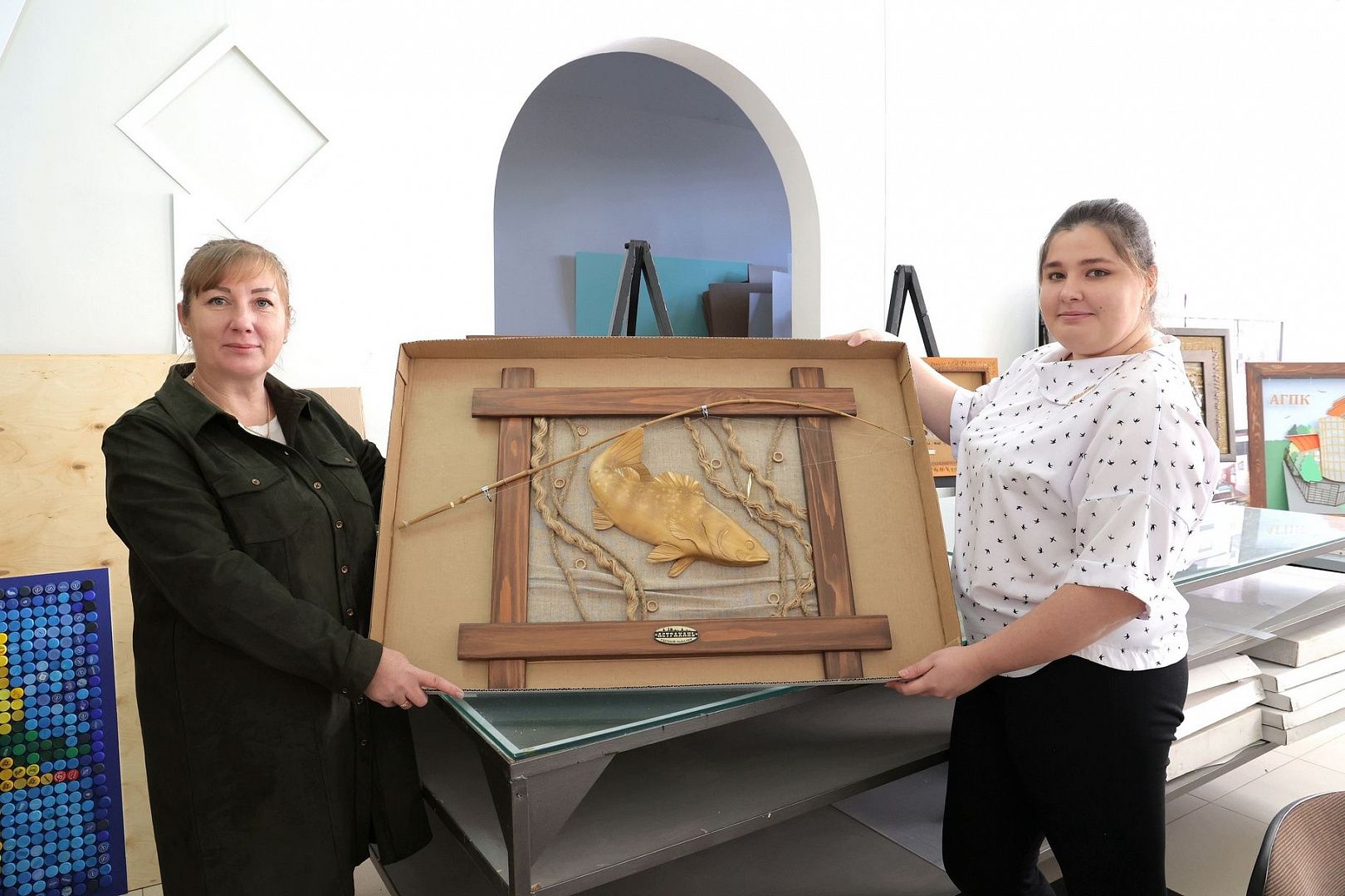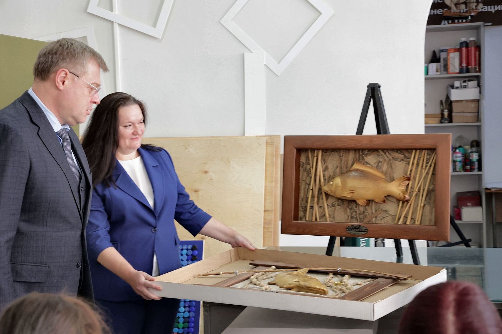 Игорь Бабушкин посетил также лабораторию макетирования графических работ, где проходило занятие у будущих дизайнеров. На память о встрече губернатору подарили декоративное панно из дерева, сделанное руками наших студентов.