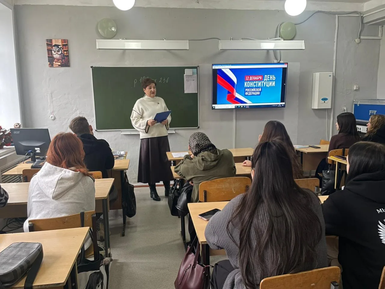 В преддверии Дня Конституции Российской Федерации, который отмечается 12 декабря 2025 года, для студентов первого курса юридической специальности Лиманского филиала АГПК прошел тематический правовой час «Конституция о выборах и не только». Инициатором и организатором встречи выступила председатель территориальной избирательной комиссии Лиманского района Астраханской области Инна Викторовна Бакурская, которая в доступной форме рассказала обучающимся о роли Основного закона в жизни государства и граждан.