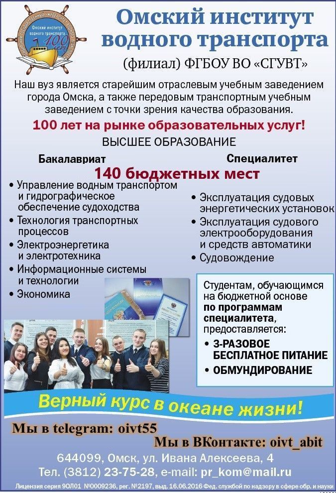 Омский институт водного транспорта - филиал ФГБОУ ВО "Сибирский государственный университет водного транспорта" приглашает выпускников АГПК к поступлению на профильные специальности высшего образования по очной, очно-заочной и заочной форме обучения.