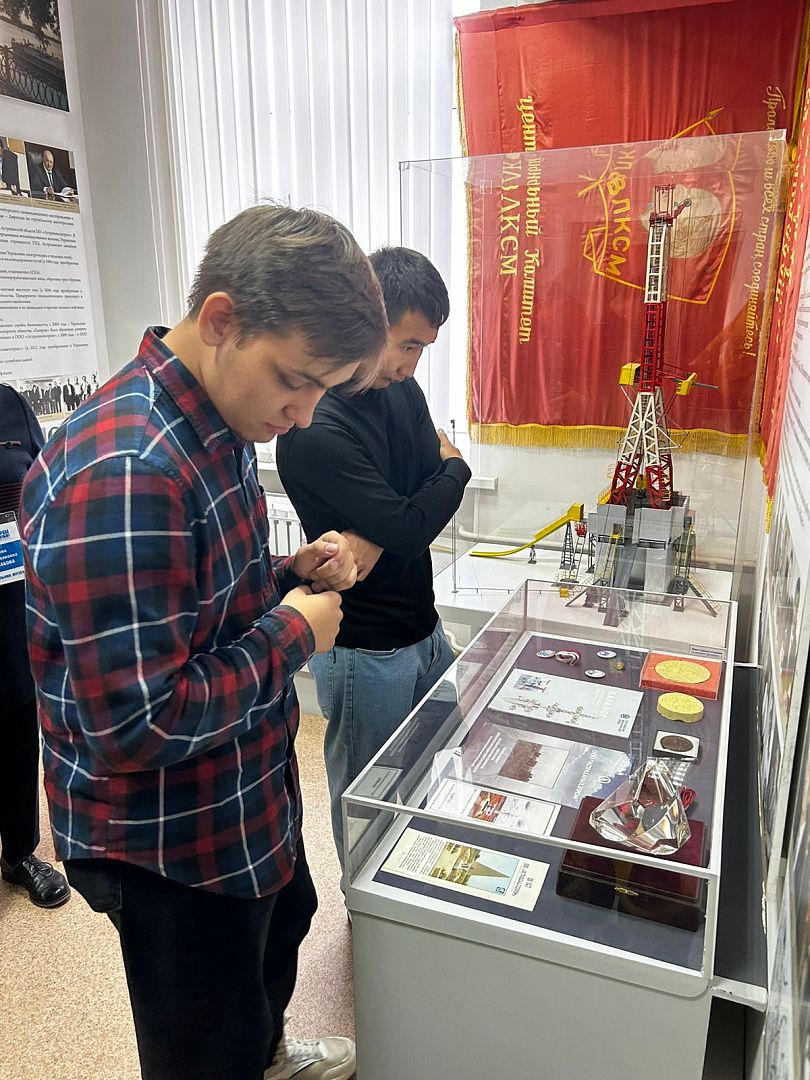 Ребятам рассказали, что создание музейной экспозиций исходило из открытия самого месторождения, строительства АГК, развития бурения, создания промысла, развития базы переработки сероводородного сырья, создания условия транспортировки и реализации продукции, проблем эколого-правового функционирования АГК, научного обеспечения деятельности АГК, социального развития и значимости АГК для региона.