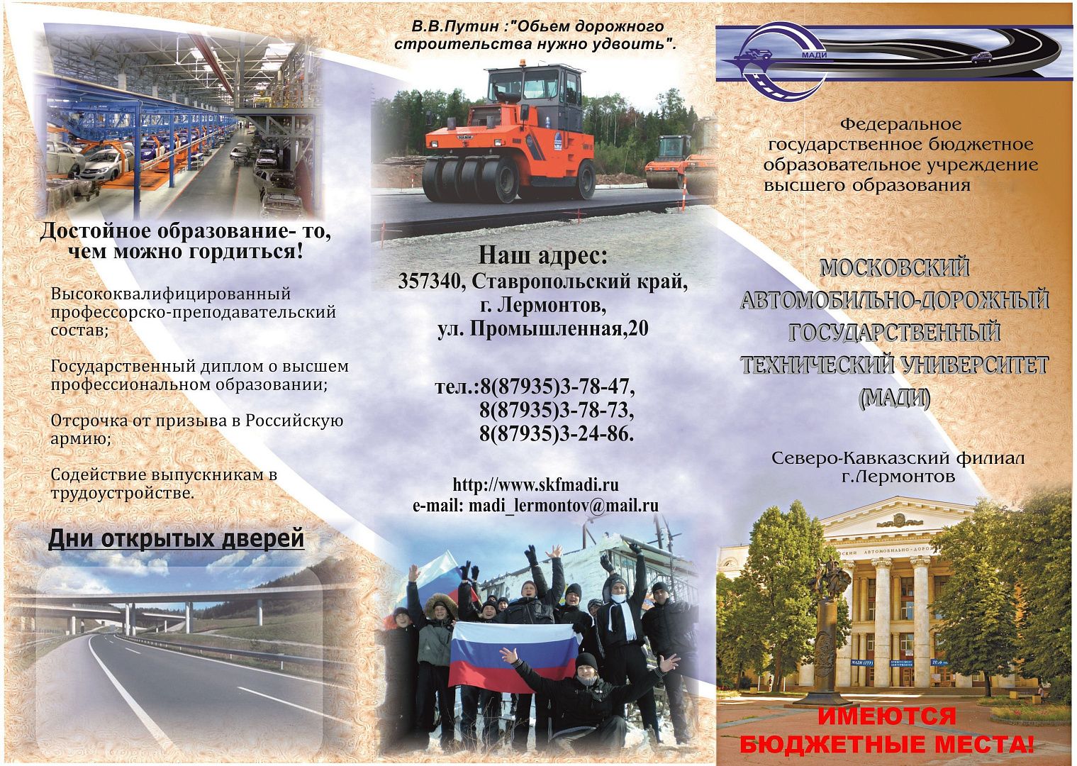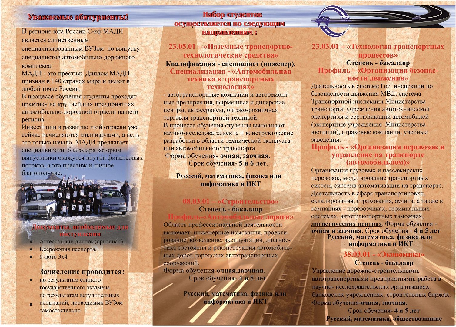Северо-Кавказский филиал Московского автомобильно-дорожного государственного технического университета приглашает на обучение и сообщает. что в 2024 году в филиале увеличено количество бюджетных мест по всем направлениям подготовки и специальностям, за исключением "Экономика".