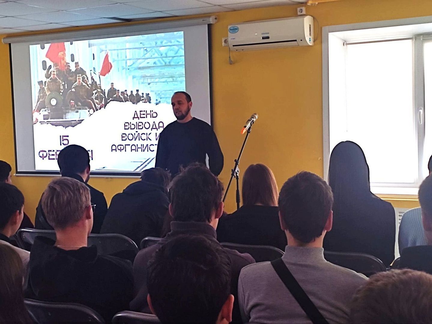 Студенты группы ОПТ-1109 с куратором Натальей Викторовной Лисуновой приняли участие в литературно-музыкальной встрече «Афганистан: без права на забвение». Мероприятие было направлено на формирование у молодежи гражданской позиции, укреплению авторитета армии и уважения к старшему поколению.