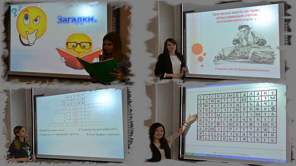 Преподавателем Стефаниди О.В. был проведен урок-защита творческих работ студентов по МДК 01.01 Практические основы бухгалтерского учета имущества организации по теме «Теоретические основы разработки и применения Плана счетов бухгалтерского учета в финансово-хозяйственной деятельности организации». Для закрепления и систематизации знаний студентам было дано творческое задание по ранее пройденной теме «Классификация бухгалтерских счетов».