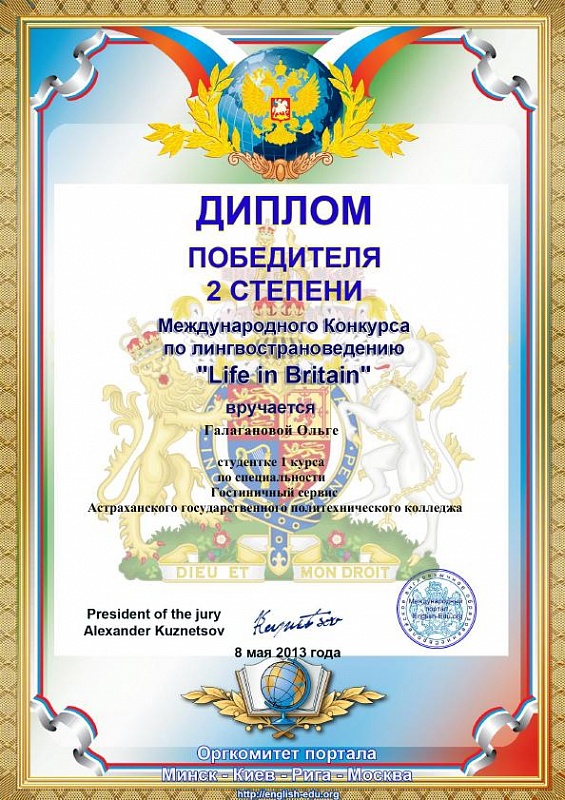 Студенты ОТДЕЛЕНИЯ СЕРВИСНЫХ ТЕХНОЛОГИЙ приняли активное участие во Всероссийском конкурсе сочинений по английскому языку «Better life in Motherland» и Международном конкурсе по лингвострановедению «Life in Britain». Наши студенты показали отличные практические знания по английскому языку и заняли следующие призовые места:
