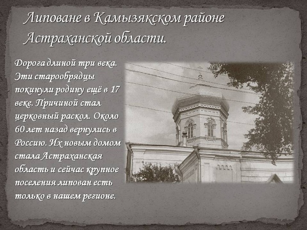 Астраханские липоване – русские-старообрядцы, реэмигранты из Румынии (сёл Сарикей и Каркалиу Тульчинского уезда). Их предки-старообрядцы, не принявшие реформы патриарха Никона середины XVII в., покинули территорию Российской империи и переселились в устье Дуная, в район Добруджи (в совр. Румынии). В XVIII в., в эпоху правления Петра I и Анны Иоанновны, к ним присоединились новые группы старообрядцев – беженцев из России. На Дунае со временем они стали называться «липоване». Сами липоване это название объясняют по-разному: оно является производным либо от «филипповцы» (один из старообрядческих толков), либо от имени полковника Липеня, который якобы увёл их в изгнание, или же от липы – любимой липованами породы дерева, из которой они изготавливали иконы. В 1947 г., по договорённости между СССР и Румынией, румынские липоване получили возможность вернуться на родину. Тех липован, которые воспользовались этой возможностью, поселили в Астраханской области. Ныне они проживают в селах Успех, Увары и Раздор Камызякского района и в селе Речное Харабалинского района, а также и в самом городе Астрахань.