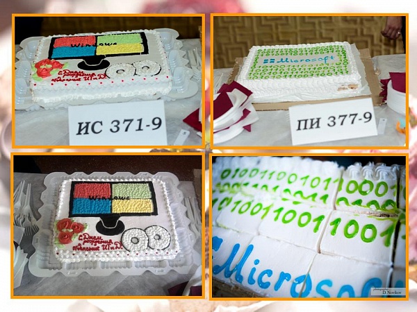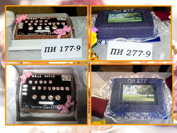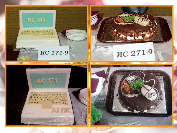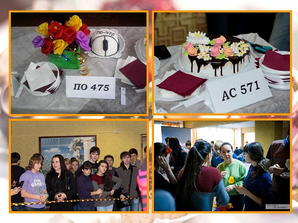 Это была не просто акция, а конкурс тематических кондитерских изделий. Приурочен конкурс был к Дню рождения отделения, потому в оформлении и тортов, и пирожных должны были быть использованы элементы, отражающие специальность учебной группы. На конкурсе работало жюри в составе: преподаватели – Апрышкина Татьяна Михайловна, Рассказова Людмила Викторовна, Фоминых Надежда Александровна, студенты – Асадулин Юрий, председатель КССУ колледжа (гр.АС571) и Германенко Марина, дизайнер, активная участница всех мероприятий отделения (гр.ДН392). По оценкам жюри номинации конкурса были распределены следующим образом: