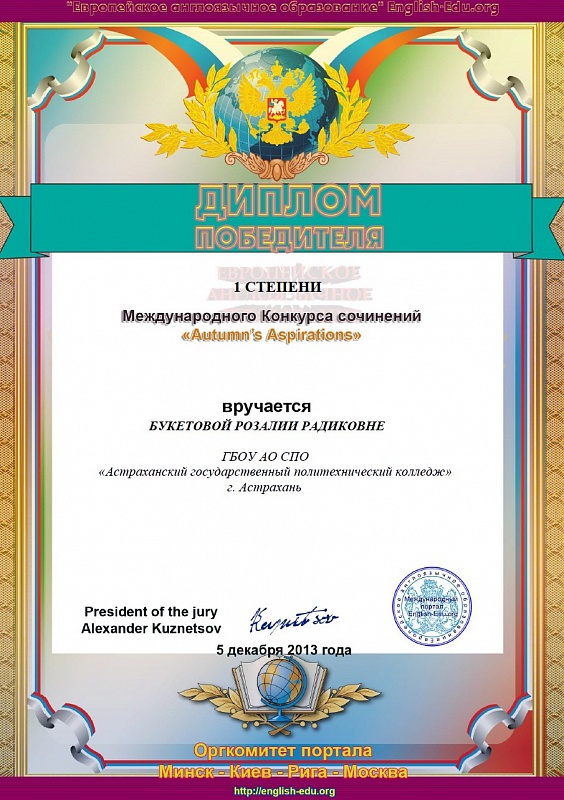 Букетова Розалия, студентка группы ЭУ-332 получила Диплом 1 степени за сочинение “Why to study”, в Международном конкурсе сочинений “Autumn’s Aspirations”.