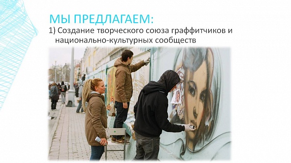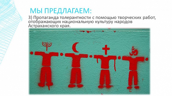Встреча прошла в дружественной и приятной обстановке. Наши ребята представили Евгению Андреевичу предварительный эскиз работы, рассказали об основных целях и задачах проекта, обговорили пути воплощения проекта в жизнь, рассказали о ближайших планах. Выслушав ребят, Е.А.Базылев отметил, что идея очень интересна и нова, а эскиз работы выполнен на высоком художественном уровне. «Этим проектом мы привлечем не только руководителей различных структур и ведомств, но и вызовем интерес у национальных сообществ Астраханской области, студентов, да и всех жителей города»-сказал Евгений Андреевич.
