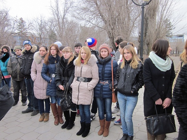 В Астрахани состоялся митинг, посвященный 25-летию вывода советских войск из Афганистана и памяти погибших воинов. Он прошёл у мемориала «Воинам интернационалистам». На митинге присутствовали студенты отделения сервисных технологий (групп ТП 281, 282, 381, 382, 481) и методист по ВР отделения СТ Расторгуева И.М. Участники митинга почтили память погибших в Афганистане минутой молчания и возложили цветы к мемориалу.