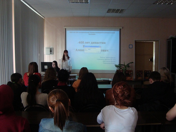 В марте 1613г. решение Земского собора получило поддержку в народе и узаконило новую династию – династию Романовых. 2013г. - стал годом празднования 400-летия династии Романовых. Студенты «Астраханского государственного политехнического колледжа» совместно с преподавателями гуманитарных дисциплин провели историко-литературный семинар, посвященный этому событию. Ребята с интересом собрали, систематизировали, подготовили материал для презентации и свои выступления. Темой сообщений стали правители России разных эпох. Их судьбы, трагедии и просто истории, в которых тоже были и жизнь, и слезы, и любовь. Кроме того, история дома Романовых это большой пласт собственно русской истории, оглядываясь на прошлое которой многое, понимаешь в её настоящем.