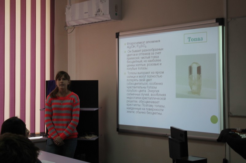 Для углубления знаний студентов-товароведов по специальным дисциплинам на базе лаборатории «Товароведение и экспертиза продовольственных товаров. Товароведение и экспертиза непродовольственных товаров» было проведено внеклассное мероприятие, посвященное камням – самоцветам. Студенты группы ТЭ-214 подготовили презентации и выступили перед студентами первого курса с рассказом о свойствах камней, легендах и преданиях, связанных с их использованием, о применении камней в ювелирном деле. Рассказ сопровождался показом натуральных образцов.