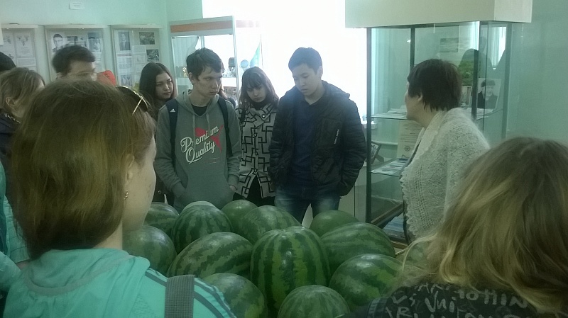 Студенты познакомились с различными сортами арбуза, узнали о полезных свойствах арбуза. Экскурсовод Шустова Н.И. рассказала о выращивании хлопка, лекарственных растениях.