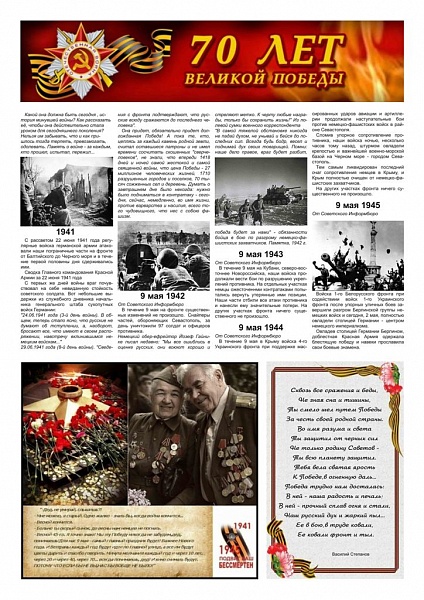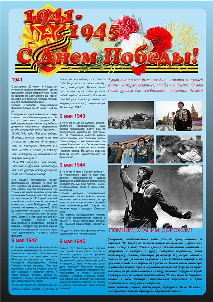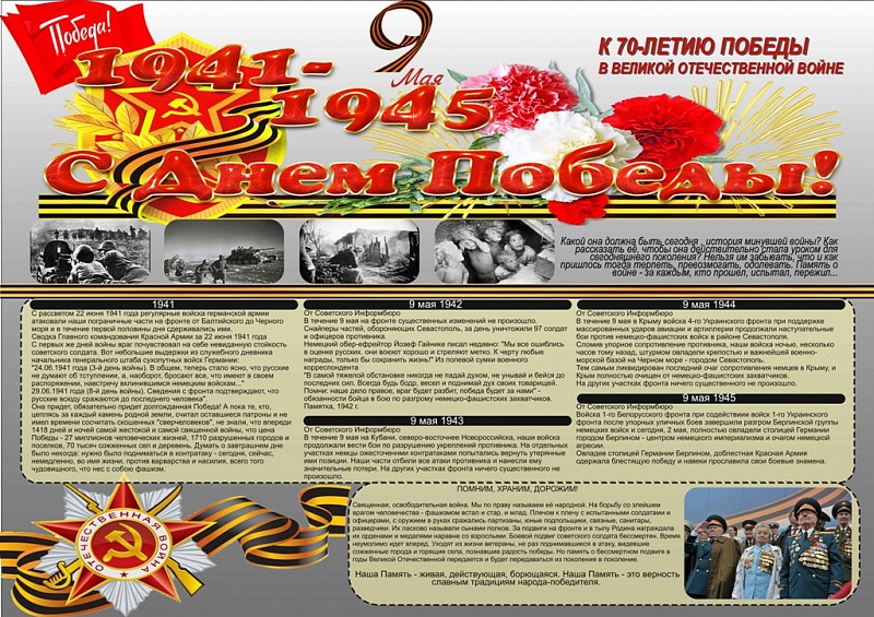 9 мая 1945 года - не просто историческая дата. Великая Отечественная война стала для нашей Родины тяжким испытанием, но не сломила наш народ. День Победы всегда будет напоминать нам о том, какой ценой завоеван мир на Земле, о том, что довелось пережить людям в то суровое время.