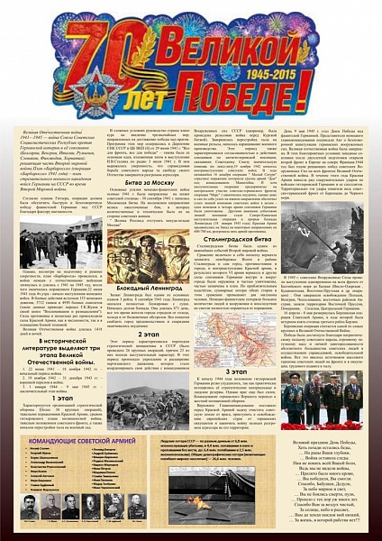 В преддверии этого большого праздника на отделении информационных технологий и дизайна прошел конкурс информационных плакатов, приуроченных к этой знаменательной дате. Студенты специальности 230701 Прикладная информатика в дизайне в рамках учебной практики по профессиональному модулю ПМ.06 Основы дизайна (МДК 06.03 Типографика и основы верстки) под руководством преподавателя Лидии Крутовой разработали информационные плакаты, посвященные Великой Отечественной войне.