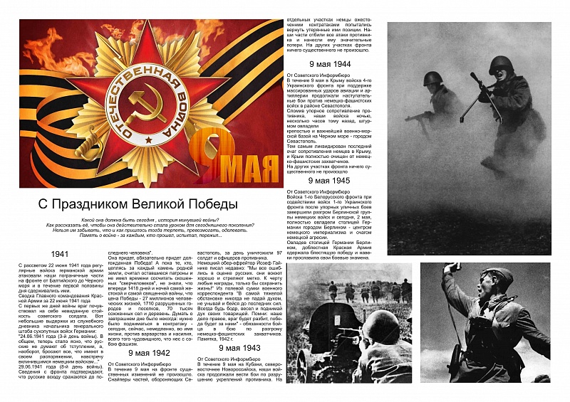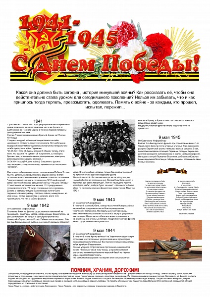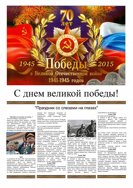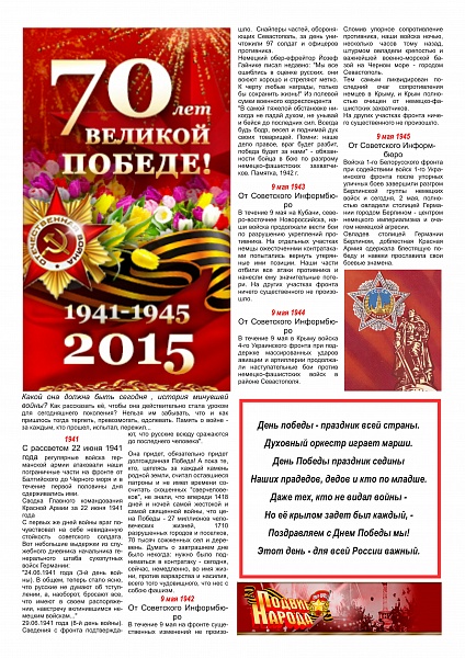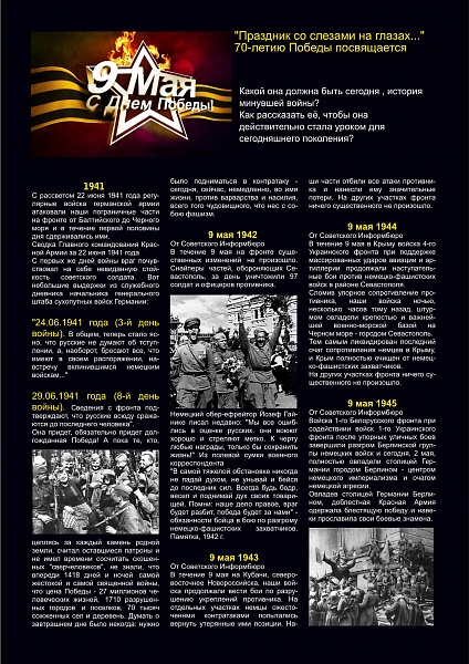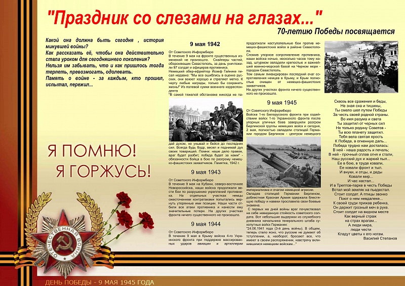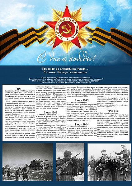 Завершился конкурс информационных плакатов, посвященных празднованию 70-летия Победы советского народа в Великой Отечественной войне. Предлагаем всем посетителям сайта ознакомиться с работами студентов группы ПИ277, выполненных под руководством преподавателя Лидии Алексеевны Крутовой.