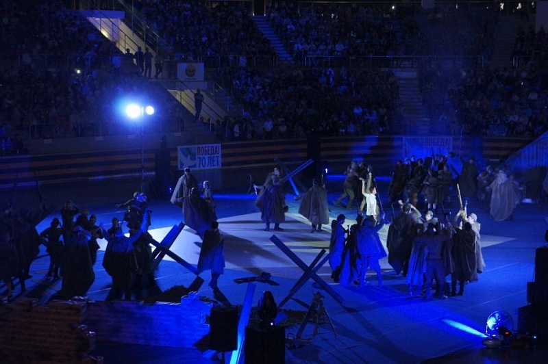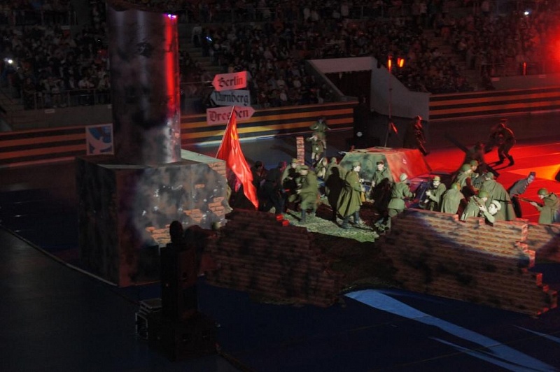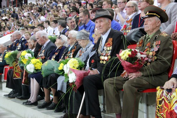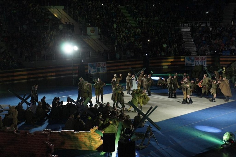 Начался концерт с торжественного выхода ветеранов. Приветствуя героев войны, зал аплодировал стоя. Эти люди смогли приблизить Победу и стали свидетелями дня, когда ликовала вся страна. Именно события 9 мая 1945 года постарались реконструировать юные артисты. Может быть, это не было достоверно с точки зрения истории, но уж точно впечатлило зрителей. «Нет – фашизму», - сказали участники концерта и бросили к ногам ветеранов знамёна поверженного врага, как когда-то бросали участники первого Парада Победы.