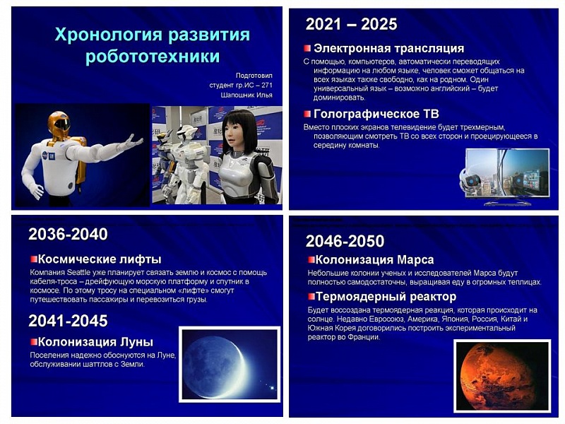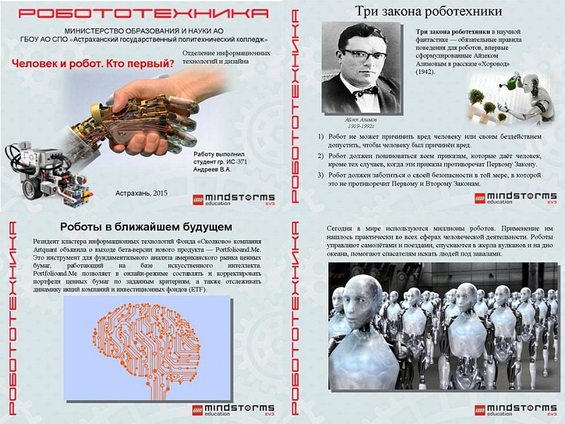 На конференции приняли участие студенты групп ИС171, ИС271, ИС371, ИС471, КС174. Много внимания студенты уделили истории и развитию робототехники.