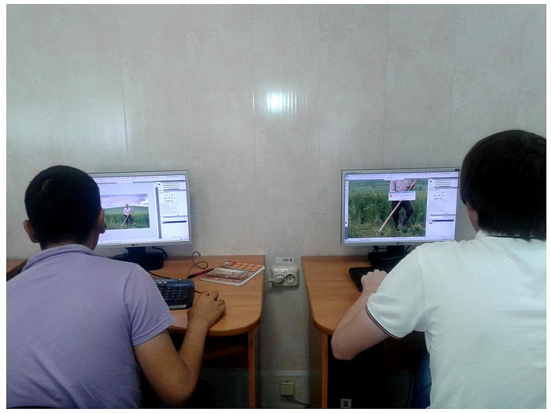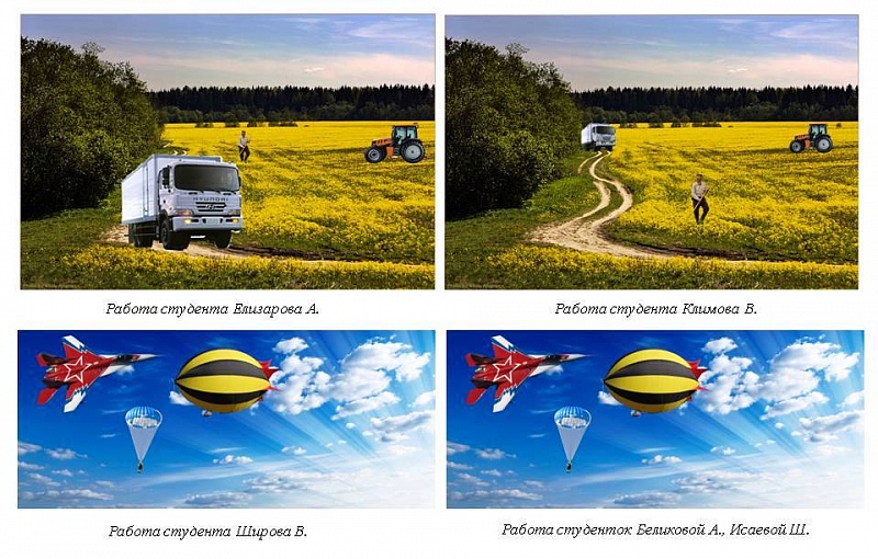 В начале урока преподаватель вместе со студентами повторили особенности использования альфа-каналов в графическом редакторе Adobe Photoshop, а затем студентам были предложены практические задания. Разным группам студентов достались разные по тематике коллажи: «Поле», «Небо и самолет», «Глубины моря», «Воздушный шар».