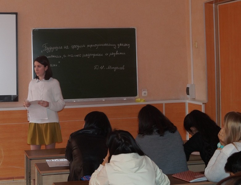 В группе ЗИ 112 прошел открытый урок-путешествие «Периодическая система. Периодический закон Д. И. Менделеева». В ходе занятия студенты подготовили сообщения об открытии периодического закона, о жизнедеятельности Д.И. Менделеева, читали стихи о свойствах металлов и рассказывали о применении некоторых химических элементов в повседневной жизни человека.