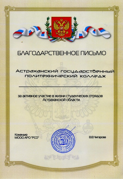 ГБОУ АО СПО «АГПК» был награжден благодарственным письмом за активное участие в жизни студенческих отрядов Астраханской области.