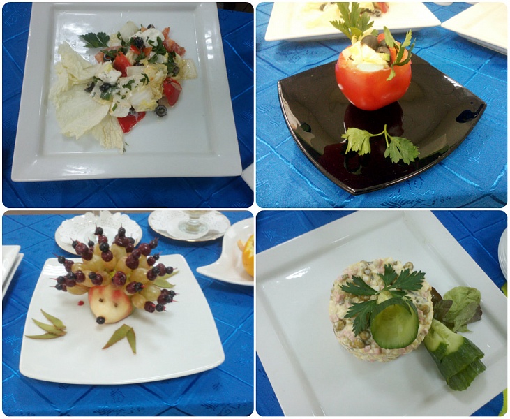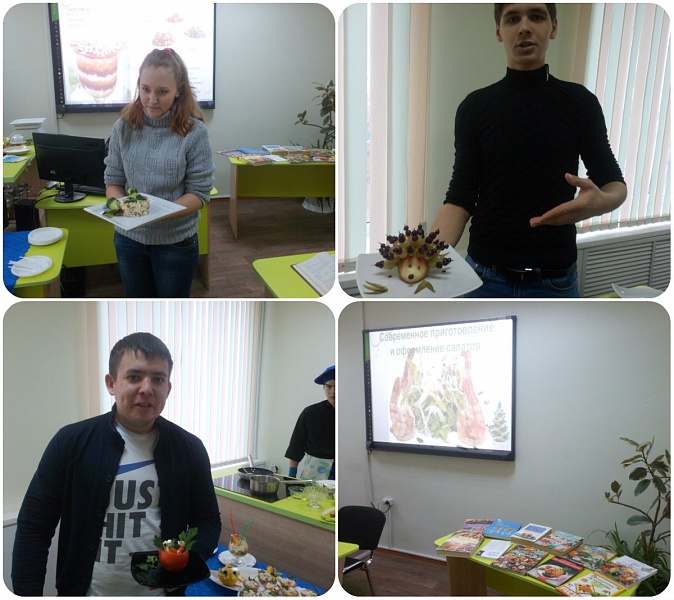 Наибольшую заинтересованность вызвал у студентов и школьников материал о современных и востребованных в ресторанной кухне приемах и способах приготовления и оформления салатов; зрелищный мастер-класс по приготовлению фруктового салата «Фрукты фламбе» (Абрамов К., гр. ТП-382) и теплого салата «Индейка с рукколой и экзотическими пряностями» (Родионов А., гр. ТП-382); дегустация приготовленных салатов.