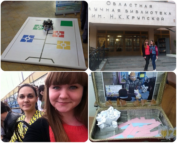 Студенты отделения сервисных технологий специальности «Гостиничный сервис» и «Туризм» приняли активное участие в акции «Библионочь – 2016» и посетили областную научную библиотеку им. Н.К. Крупской. В ней были организованы выставки книг и журналов о развитии киноиндустрии в России, здесь проходил киноквест «Ожившая книга» об экранизации литературных произведений, а также проект «Стоп. Кадр», участники которого повторяли самые яркие кинообразы советского кино. Особой популярностью пользовалась площадка «Час «Ч», там каждый мог почувствовать себя «звездой экрана», записав короткий рассказ Чехова на камеру и тут же увидев себя на экране.
