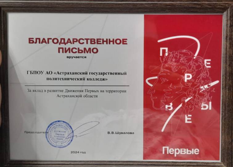 Первичное отделение «Движения Первых» АГПК по итогам уходящего года отмечено благодарственным письмом за вклад в развитие «Движения» на территории Астраханской области.