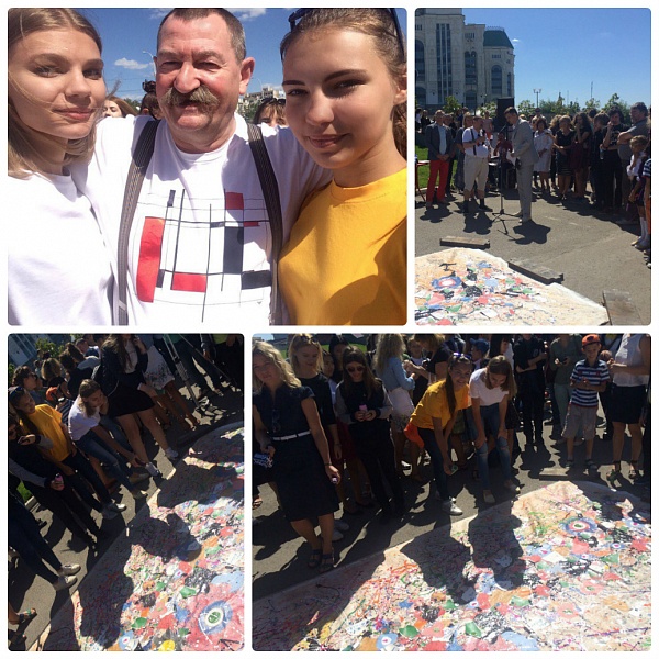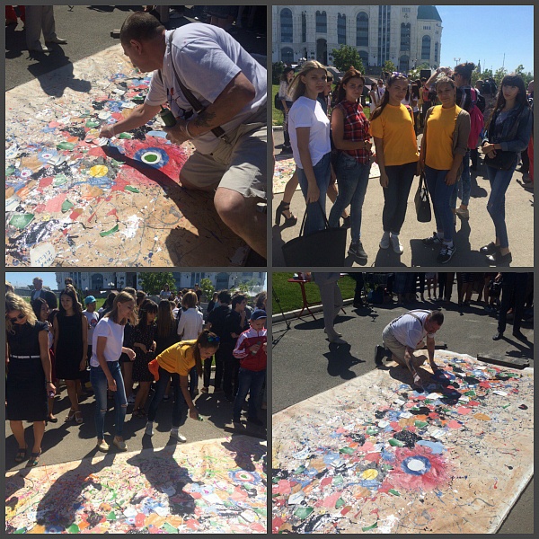 Студенты отделения экономики и права 2 сентября стали участниками социально-культурной акции от модного бельгийского художника Дениса де Глуара. Денис де Глуар – известный во всем мире последователь яркого представителя абстрактного экспрессионизма американца Джексона Поллока. Именно в нашем городе автор завершил свою трехлетнюю работу под названием «Во имя мира». Начало ей было положено 11 сентября 2013 года в Москве. Дата была выбрана не случайно – картина посвящается жертвам террористических актов и всеобщей борьбе за мир.