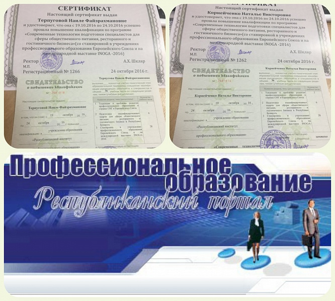 Зав. отделением сервисных технологий Корнейченко Н.В. и преподаватель спец. дисциплин Терпугова Н.Ф. прошли программу повышения квалификации «Современные методики подготовки специалистов для сферы общественного питания, ресторанного и гостиничного бизнеса на примере Республики Беларусь» в УО «Республиканский институт профессионального образования».