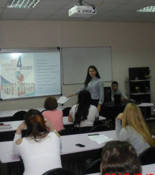 Нынешняя осень богата на праздничные события, одно из них – празднование важной даты, посвящённой Дню народного единства. Не остались в стороне от этого мероприятия и студенты отделения Экономики и права. Они подготовили и провели классные часы об истории этого праздника, главной целью которых стало раскрыть истинное значение народного единения. Ведь именно в этот день представители разных народностей, конфессий, религий и вероисповеданий, вспоминают о том, что Россия – общий дом для всех, и каждый должен внести свою лепту в ее мирное будущее, преуспевание и развитие.