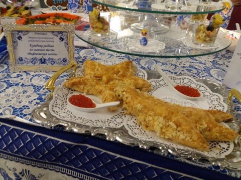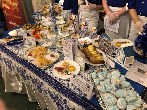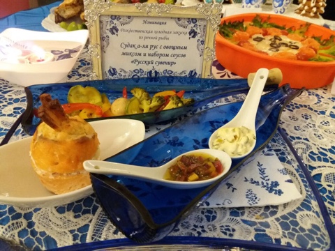 В номинации «Оформление Рождественского стола (с элементами русского народного промысла)», командой был представлен Тематический стол «Зимняя сказка - Рождество. Россия: прошлое и настоящее». Сервировка тематического стола была выполнена в стиле знаменитой на весь мир сине-бело-голубой росписи – ГЖЕЛЬ. Во 2 номинации «Рождественская холодная закуска из речной рыбы» бала представлена закуска «Судак а-ля рус, с овощным миксом и набором соусов «Русский сувенир». Этот прекрасно сбалансированный рыбный дуэт из судака и сёмги. А также в 3 номинации «Рождественская холодная закуска из птицы» была представлена закуска «Муслин из филе индейки с пряной грушей, ризотто и клюквенно-имбирным соусом». Прекрасный образец кулинарной классики, эта закуска всегда в гастрономическом тренде и неизменно пользуется большой популярностью.