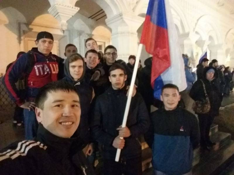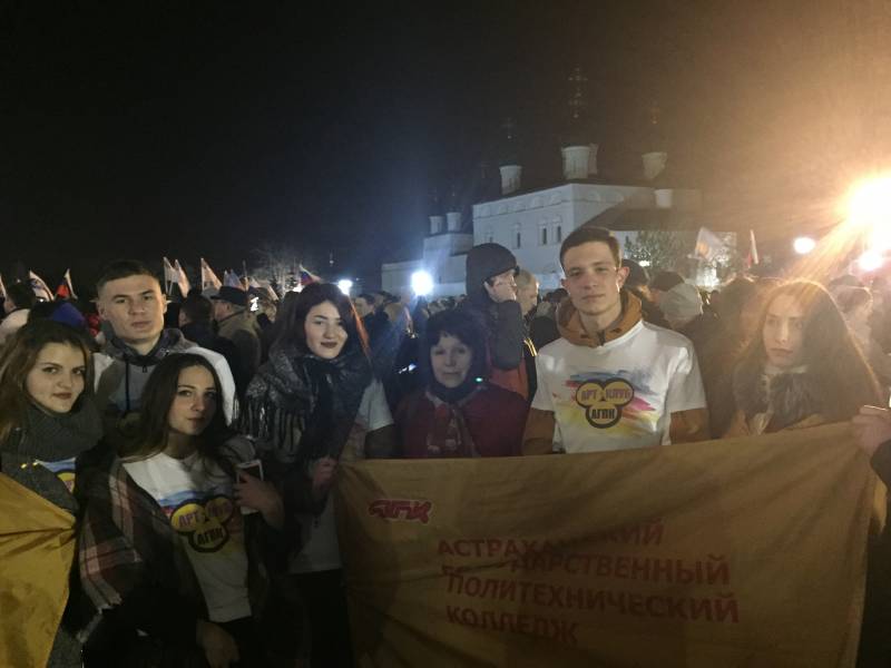 Наши студенты и преподаватели не остались в стороне от такого значимого события. На митинге присутствовали директор колледжа Жигульская Оксана Петровна, представители администрации: Кузнецова Е.А., Чурзина Г.А.; руководитель физвоспитания Кунуспаев Н.С. и преподаватель Лущиков В.А. со студентами–спортсменами; представители отделений Латышева М.С., Макарова Н.В., Шаплыгина Ю.Н. со своими студентами; Фиалковская А.О. с членами «Арт-клуба АГПК».