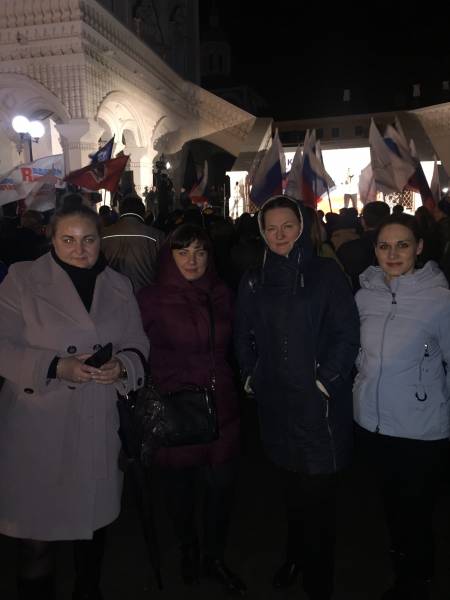 В воскресенье вечером в Кремле состоялся митинг-концерт, посвящённый четырёхлетию присоединения Крыма к России. Патриотическая акция собрала на площади возле Успенского собора около двух тысяч человек. Они размахивали триколорами, танцевали под патриотические песни и активно встречали всех, кто выходил на сцену.