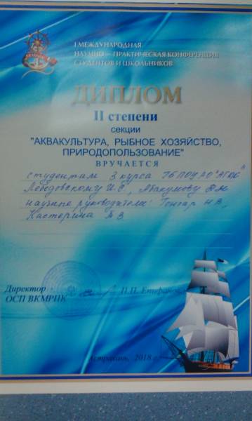 В Волго – Каспийском морском рыбопромышленном колледже прошла 1 международная научно-практическая конференция студентов и школьников. Студенты группы ИС – 371 Лебедовский Иван и Абакумов Дмитрий, выступившие с докладом «Нефть как угроза экологической безопасности» заняли 2 место, а студентка группы ДН – 391 Волкова Наталья покорила слушателей эмоциональностью, доступностью изложения и содержанием самого доклада «Фрактальная графика и ее применение в городском дизайне».