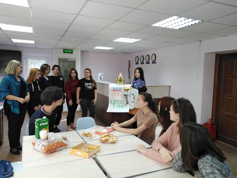 Студенты рассказали об обычаях в своих семьях, о дружбе между различными национальностями, о единстве взглядов и интересов, подготовили поздравительный плакат. В России День народного единства становится все популярней, так как гордость за свою Родину, за ее прошлое и настоящее, вера в ее счастливое будущее – это то, что объединяет людей и делает их единым народом.