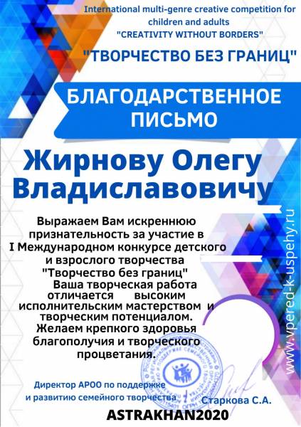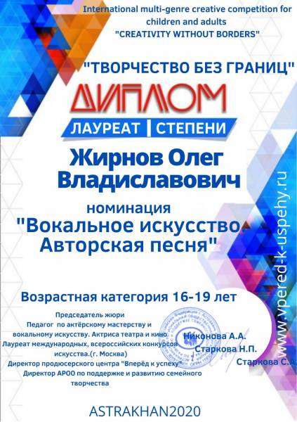 В мае прошел International multi-genre competition for children and adults «Creativity without borders» (Творчество без границ), где Жирнов Олег стал Лауреатом I степени, в номинации «Вокальное искусство. Авторская песня» .